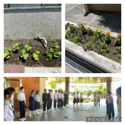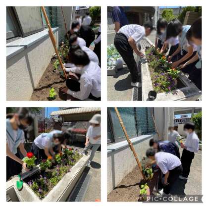 昭和中学校では、学校元気アップの方と一緒におもに植物のお世話をするふれあい委員という活動があります。今日は中間テストが終わったあと、お花とゴーヤの苗植えを行いました。これから当番を決めて毎朝、水やりもしていく予定です。