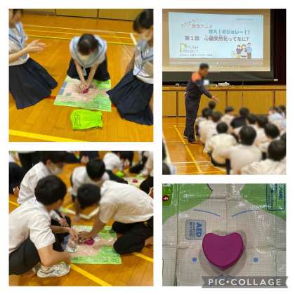 1年生は多目的室で実際の映像も交えながら地震のメカニズムや、地震が発生したらどうすれば良いかを学びました。2年生は武道場で防災に関する話、体育館前で消火器や煙の体験をしました。3年生は体育館で心肺蘇生法を学びました。