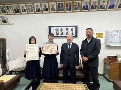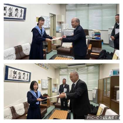 また、放課後には税の作文の表彰式を校長室で行いました。3年生が夏休みの宿題で提出した中から2人の生徒が賞をいただきました。おめでとうございました!