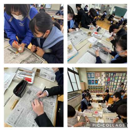 3年美術 篆刻、1年百人一首の練習