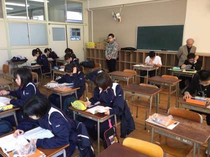 1月16日(土)実用英語技能検定(英検)を1週間後にひかえ、恒例の学校元気アップ主催の英検学習会を行いました。今回の英検には全校生徒の1割強の生徒がチャレンジし、グレードも2級から5級までの幅広い受験となります。今日の学習会には希望生徒12名が参加。学習ボランティアの方々も来ていただいて、みんな集中して学習していました。