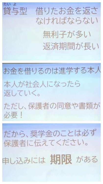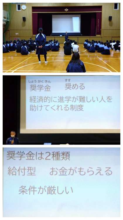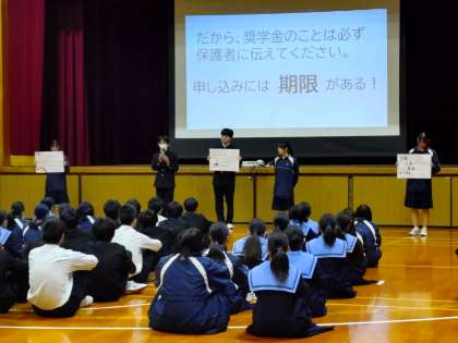今朝は、各学年の集会がありました。3年生では、担当の先生から『奨学金』についてのお話がありました。