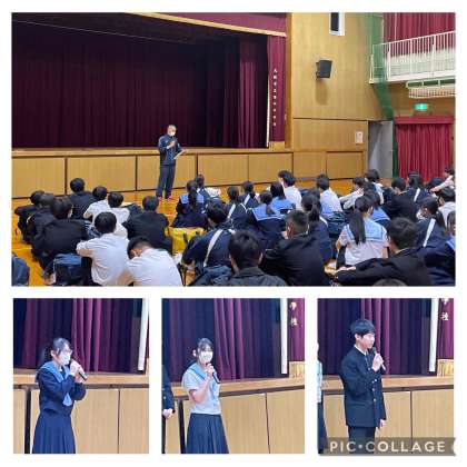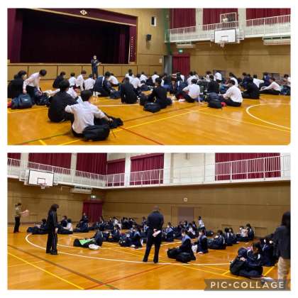 3年生はいよいよ明日から修学旅行です。朝から荷物を武道場に運び入れ、6限の事前指導で最終チェックを行いました。最後は実行委員長からの一言で気持ちを高めていました。