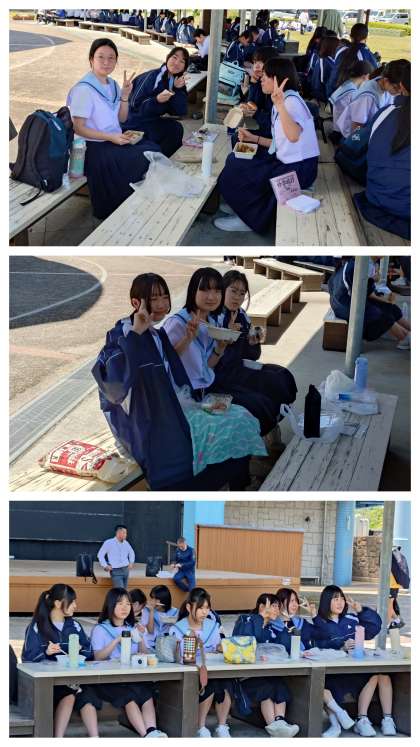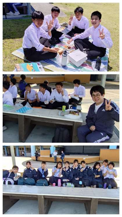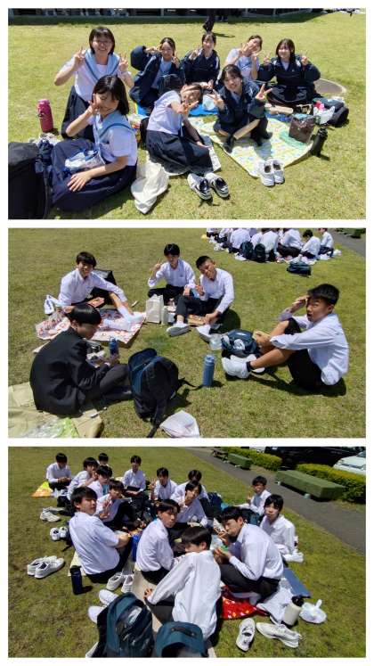 お弁当の時間です。天候も良く、暖かく、芝生の上でのお弁当「最高で〜す!」
