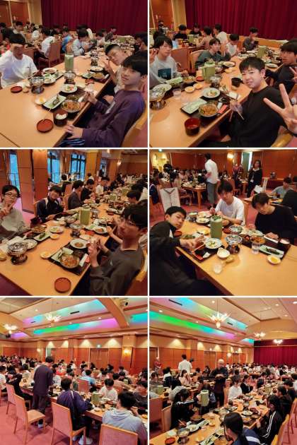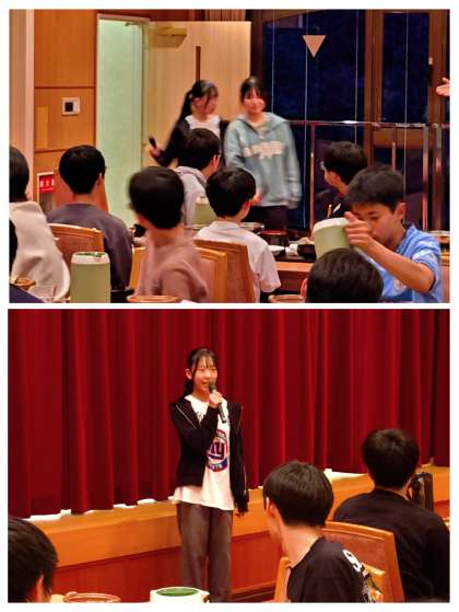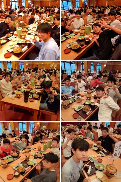 夕食の様子です。夕食後の挨拶では、「1秒1秒大切に、楽しい修学旅行にしましょう!」という内容のお話でした。