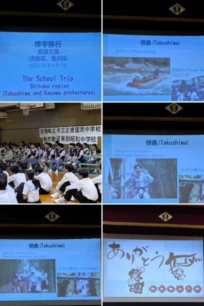本校からは、5月当初に実施した『修学旅行』の紹介の動画を観ながら、代表生徒が英語で説明をしました。歓迎集会後は、各クラスでの『授業交流』を行いました。