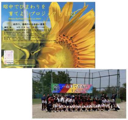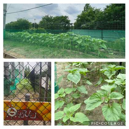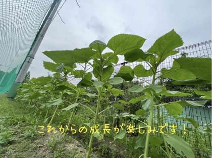 1ヶ月前に部活動の生徒たちに手伝ってもらい実施した「ひまわりプロジェクト」。ひまわり畑のようすを見に行ってみると、しっかりすくすく育っています。満開のひまわりを見るのが今からとても楽しみですね!