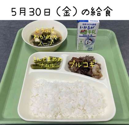 プルコギは韓国料理のひとつで、甘めのタレに漬け込んだ肉と野菜を炒めたものです。「プル」は火、「コギ」は肉という意味で直訳すると「火で焼いた肉」となります。スープも具沢山で美味しかったですね。