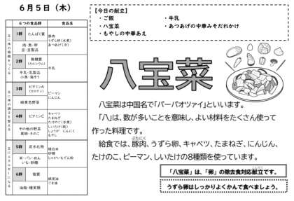 今日の献立「八宝菜(はっぽうさい)」にちなんで。中国では8が縁起のよい数字とされます。8に「発」という漢字をかけているそうですが、この漢字には「発展する」「金持ちになる」などの意味があるので人気なんですね。ところで皆さんの好きな数字は何ですか?