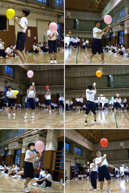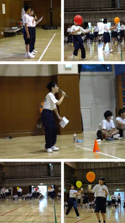 写真は、開会式、『風船運びリレー』の様子です。盛り上がっています。実況兼審判の動きがすばらしい。
