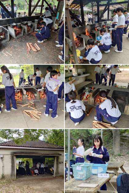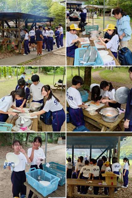 カレーの材料とお米研ぎも終わり、いよいよかまどに火が入りました。完成が近づいているのようです。食器をきれいに拭いて準備を手伝っている生徒もいました。