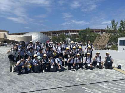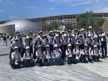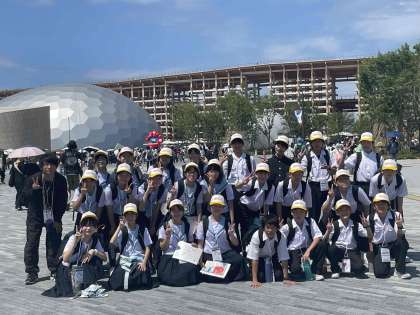 入場時の学級写真、さあ、班に分かれてパビリオンへ!