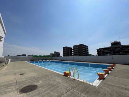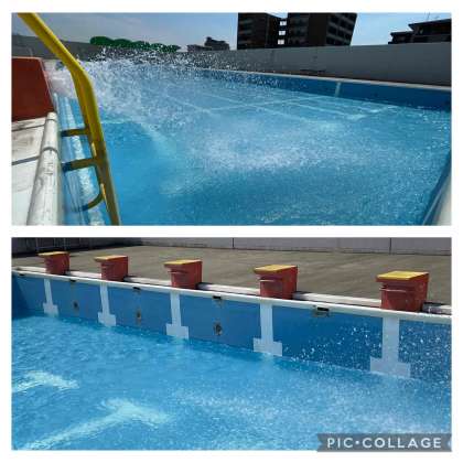 今日は梅雨前線はどこへ行ったの?と言いたくなるような快晴で、気温もかなり高くなるようです。学校ではもうすぐ水泳授業が始まるので、今日は注水中のプールのようすを撮影しました。太陽の光が水面に反射してキラキラ輝いているのを見ると「夏が来たなぁ…」と思わずにはいられません。