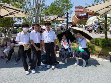 本日、5組目!子どもたちも少しずつ集合場所の東ゲート近くで暑さをしのいでいるようです(写真に写っている黒い物体は、パワー全開の『ミスト扇風機』です)。