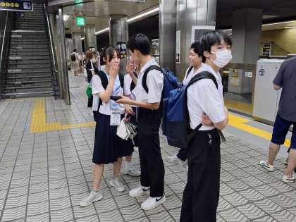 最後の班が、15時20分に学校に到着しました。軽い熱中症の症状の生徒もいましたが、無事に全員学校まで帰ってきました(写真は、最後の班が谷町四丁目に到着したところです)。