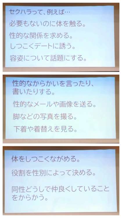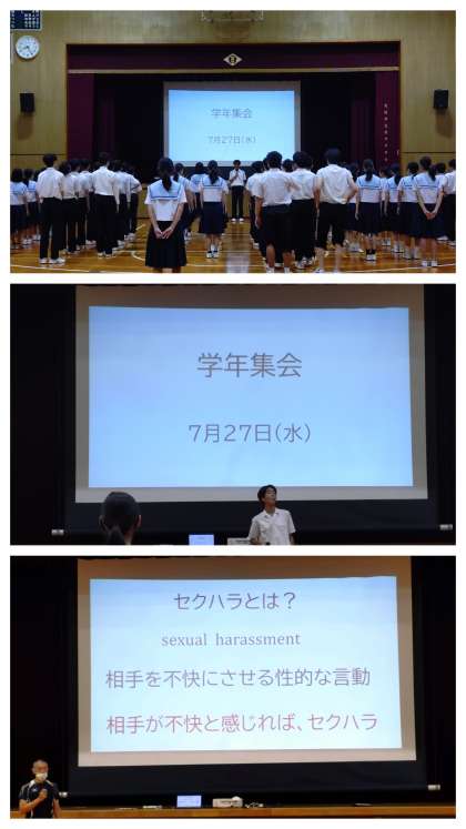 今朝は、3年生の学年集会がありました。担当の先生からは、『セクハラ(セクシャルハラスメント)』についてのお話がありました。「セクハラとは?」相手を不快にさせる性的な言動で、相手が不快と感じれば、『セクハラ』となる。