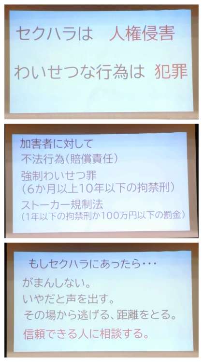 「具体にどのようなことがセクハラとなるのか」「法的には、ストーカー規制法・わいせつ罪等々」「もし、セクハラの被害にあったら」などのお話がありました。