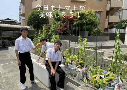 さて、今日も昼休みにトマトを収穫している生徒を撮影しました。トマトはいい感じに赤くなっていて収穫時ですが、きゅうりは…一刻も早く収穫してあげてください!もはや黄色くて巨大な何かになってますよ!