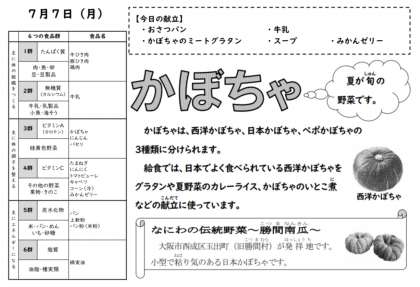 西洋かぼちゃの旬は、収穫時期の夏から秋冬で給食にもよく利用されていますね。また日本かぼちゃは、なにわの伝統野菜の一つ、「勝間南瓜(こつまなんきん)」が知られています。現在の西成区玉出あたりが発祥だそうです。