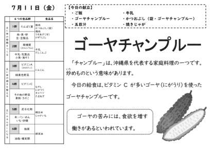 「チャンプルー」は沖縄の方言で、おもに「混ぜこぜにしたもの」という意味で使われました。語源はインドネシア語やマレー語の「チャンプル(campur)」で、「混ぜる」という意味です。今日はゴーヤのチャンプルーでしたが、他にもソーメン、豆腐など色々な組み合わせで作られています。