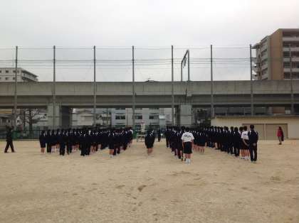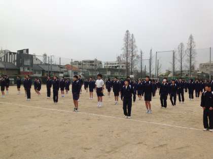 3月16日、恒例の1・2年生マラソン大会を行いました。2限の授業後に、1・2年生合同での行事です。開会式で、学校長からの話があり、全員でラジオ体操第2を行いました。