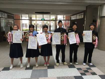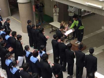 競技終了後、給食を食べた後、ピロティで閉会式を行いました。男女それぞれ上位10人が発表され、上位5人には表彰状が、さらに上位3人には盾も授与されました。