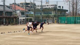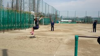 春休み中ですが、学校では部活動を行っています。運動場では、陸上部が走り幅跳びや短距離のスタートダッシュの練習を行っています。