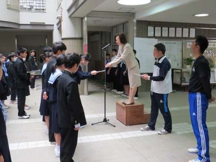 本日、朝の全校集会で前期学級委員の認証式を行いました。各学年から男女学級代表が代表で校長先生から認証状をいただきました。前期学級委員は10月中旬までの任期です。その間、自覚と責任をもって務めて欲しいと思います。