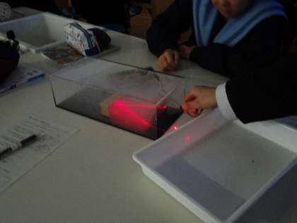 煙を入れた水槽に鏡をいれ、レーザーポインタから出た光を鏡にあて、光の道筋をiPadで撮影します。入射角と反射角の規則性がわかるように考え、さまざまな角度から撮影します。最もいい画像を見つけだし、分度器で角度を測ります。「入射角=反射角」の関係が実感できたようです。