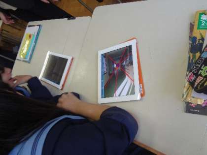 iPadで校舎内外を撮影し、iPad上で自分で撮った写真に水平線や消失点を書き込み、透視図法を使って説明したり、批評しあったりしました。