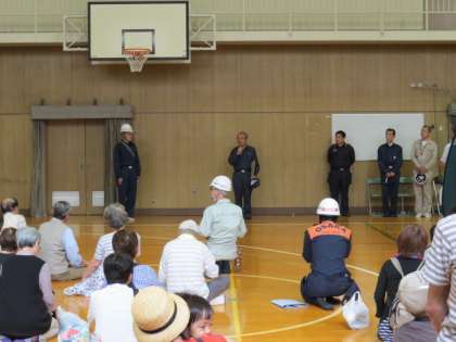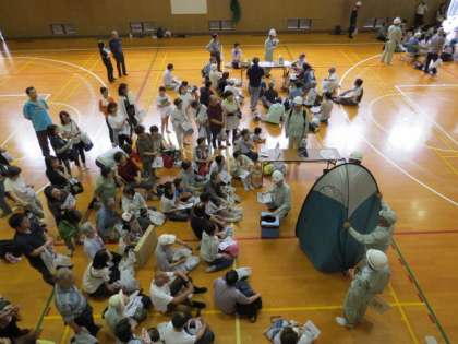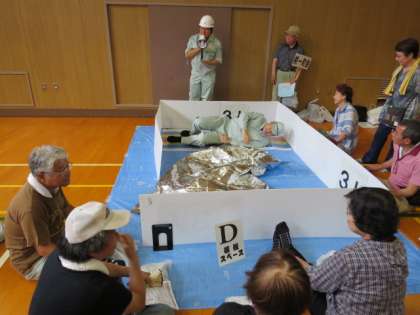 その後、「負傷者の手当て」「炊き出し」「トイレ対策」「居住スペースと非常備蓄品」の4つのブースを町会毎に順に回って説明を受けるプログラムが実施されました。途中、阿倍野区長も来られて激励のことばをかけられました。とても有意義な訓練でした。