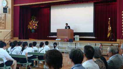 7月2日(土)、本校は土曜授業ですが、校区の長池小学校も土曜授業を活用して、新校舎の竣工式が行われました。校舎見学に続き、体育館で式典が行われました。6年生が児童を代表して式典に参列しました。写真は校長先生の式辞です。