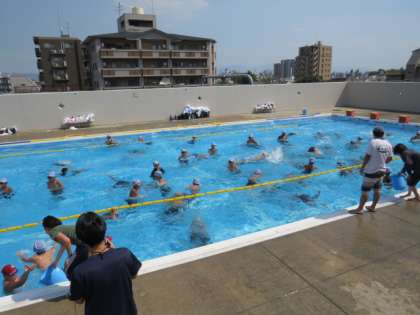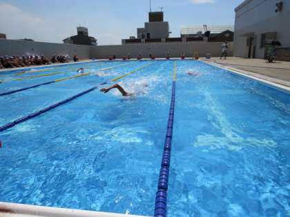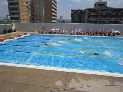 本日は絶好の水泳日和といえるほど太陽の照りつける中、1年は水泳大会を行いました。みんなルールをしっかり守り、一生懸命泳ぐことができ、全員参加の「碁石拾い」では大変盛り上がりました。結果は接戦の末、2組が優勝しました。