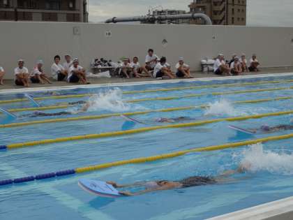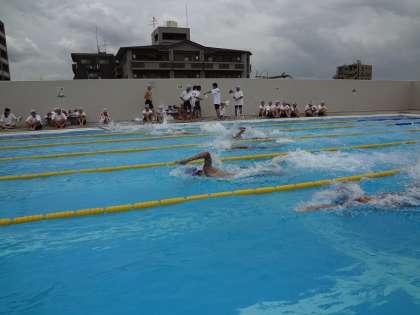 本日、2年水泳大会を行いました。先週月曜日の豪雨のために1週間延期となっていただけに、天候が心配でしたが、曇り空の中、なんとか実施することができました。時々、小雨が降ることはありましたが、みんなの気合い(?)ですぐにやみ、予定通り、競技をすすめることができました。