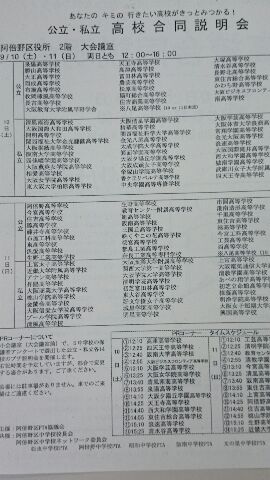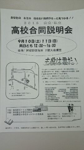 9月10日(土)11日(日)、両日とも12〜16時、阿倍野区役所で、阿倍野区PTA 協議会主催の高校合同説明会が開催されます。2日間で100以上の高等学校の進路担当者にお越しいただいて、個別にお話しが聞けます。大変いい機会ですので、是非とも時間をつくってご参加ください。