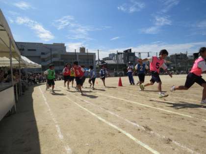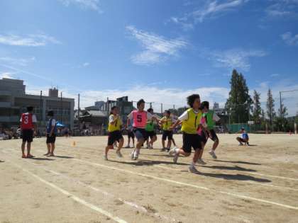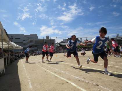午前の部、最後の種目が学級対抗リレーです。クラス皆でバトンを繋いでいきます。