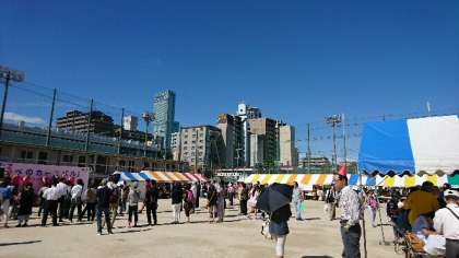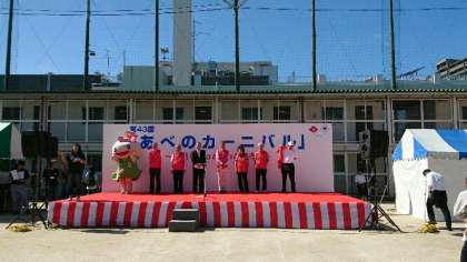 本日、工芸高校グランド、阿倍野区役所であべのカーニバルが開催されました。秋晴れのそらのもと、特設舞台で開会式が行われました。区役所では、PTAの作品展が行われ、本校からはお菓子の家の作品が出展されています。