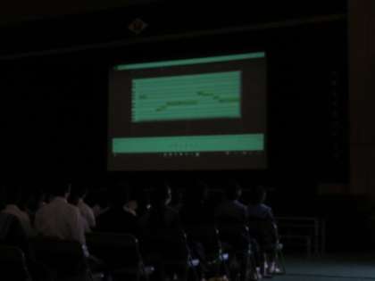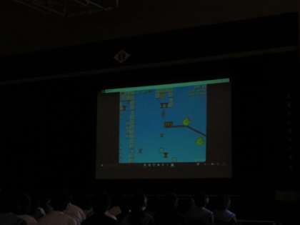 コンピューター部は各自で制作した作品を発表しました。「ボーカロイド」で校歌を歌ったり、アクションゲームを披露したり、多彩な内容でした。