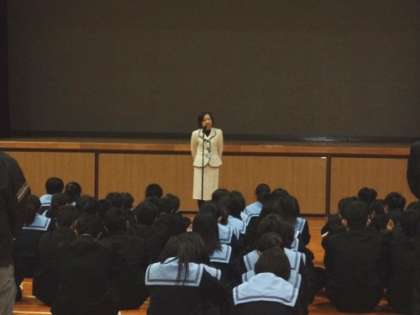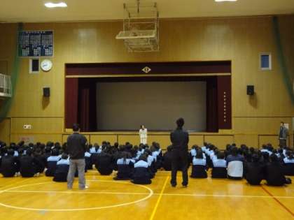 朝の冷たい緊張した空気の中での3学期のスタートです。体育館で校長先生の話、表彰状の伝達を行ないました。年度初めに決めた目標を達成するため、あきらめずに弱音を吐いたり、後ろをむいたりせず努力して欲しいという話でした。