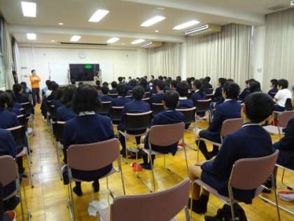 ビデオで、中学校生活や授業のようす、部活動風景を紹介しました。その後、班ごとに分かれて、部活動の見学や体験を行ないました。中学校のことを早く理解し、入学されるのを教職員も上級生も楽しみにしています。