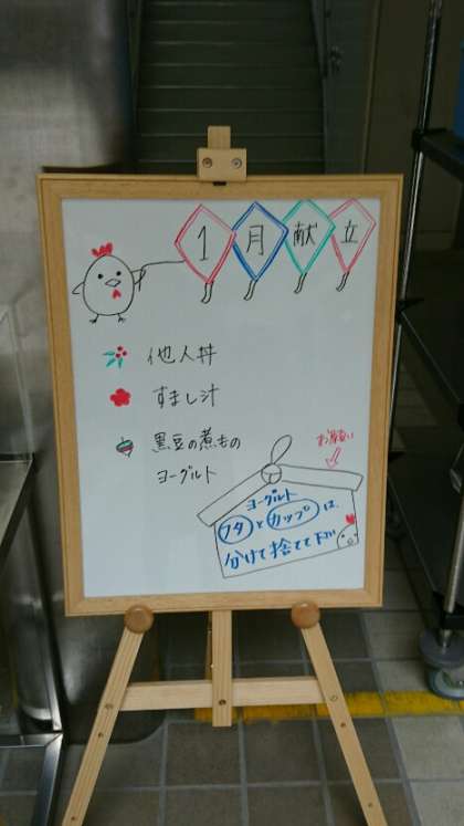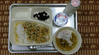 今日から給食が再開しました。本日のメニューは、他人丼、すまし汁、黒豆の煮物、ヨーグルト、牛乳です。美味しくいただきます!