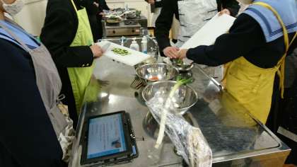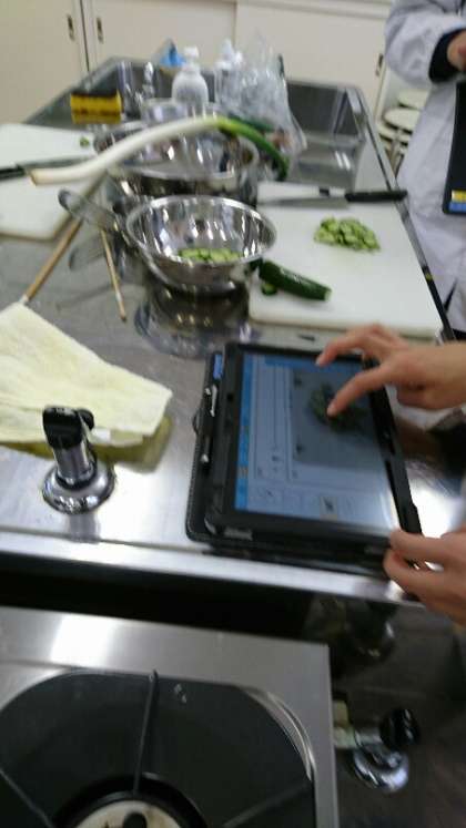 2年生が調理実習を行いました。メニューはさばの煮付けときゅうりの酢の物です。手順はタブレットPCで確認しながら、調理を行っています。