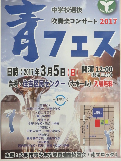 3月5日(日)に住吉区民センター大ホールにて、大阪市青少年指導員連絡協議会(南ブロック)主催の、中学校選抜 吹奏楽コンサート2017「青フェス」が開催され、本校の吹奏楽部も出演します。ぜひお越しください。