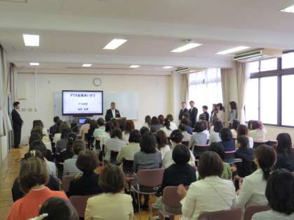 式後には1年所属の教員や、1年生に関わる教職員の紹介がありました。新入生が教室に移動した後、多目的室で保護者対象の説明会を行いました。