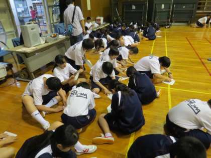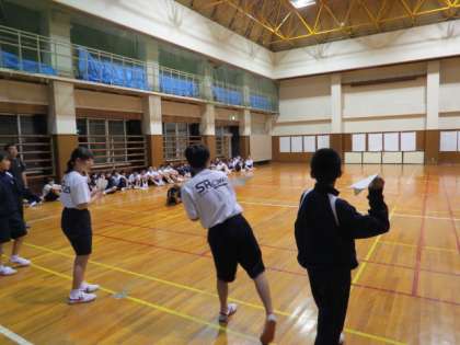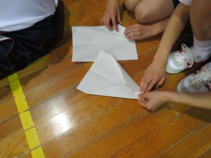 2番目の競技は「あの大空へ 風に乗ってゲーム」です。紙飛行機を折って、飛距離を競います。