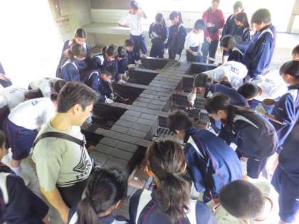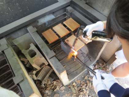 いよいよ一泊移住最後のプログラム「焼き板クラフト」です。スタッフの方の説明を聞いたのち、作業スタートです。まずは板をバーナーで焼きます。