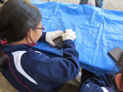 全面を焼いたあとは、ひたすらたわしで表面を磨きます。