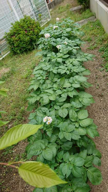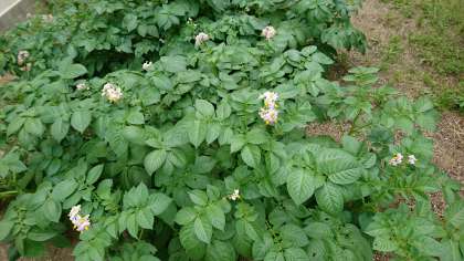夏野菜カレーの材料になるじゃがいもに花が咲いています。来月には収穫です。
