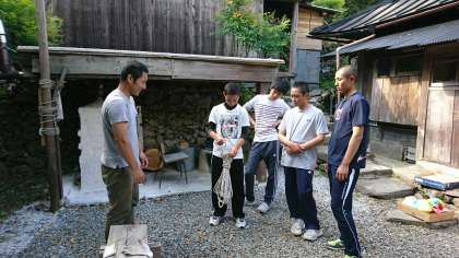 各家庭での民泊体験の様子です。茶摘みやロープの巻き方、薪割りなど、貴重な経験をさせていただいています。