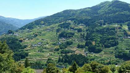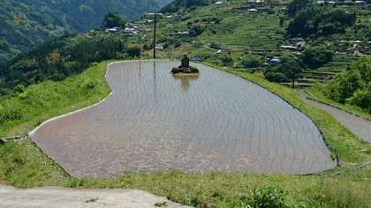 山には棚田があり、田植えが終わったところです。山の景色も新緑が鮮やかです。